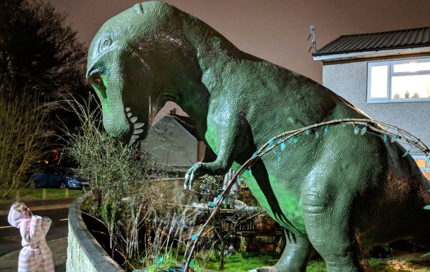 Hundreds of people have flocked to a house in Wales after a man installed a 30ft dinosaur in his front garden.