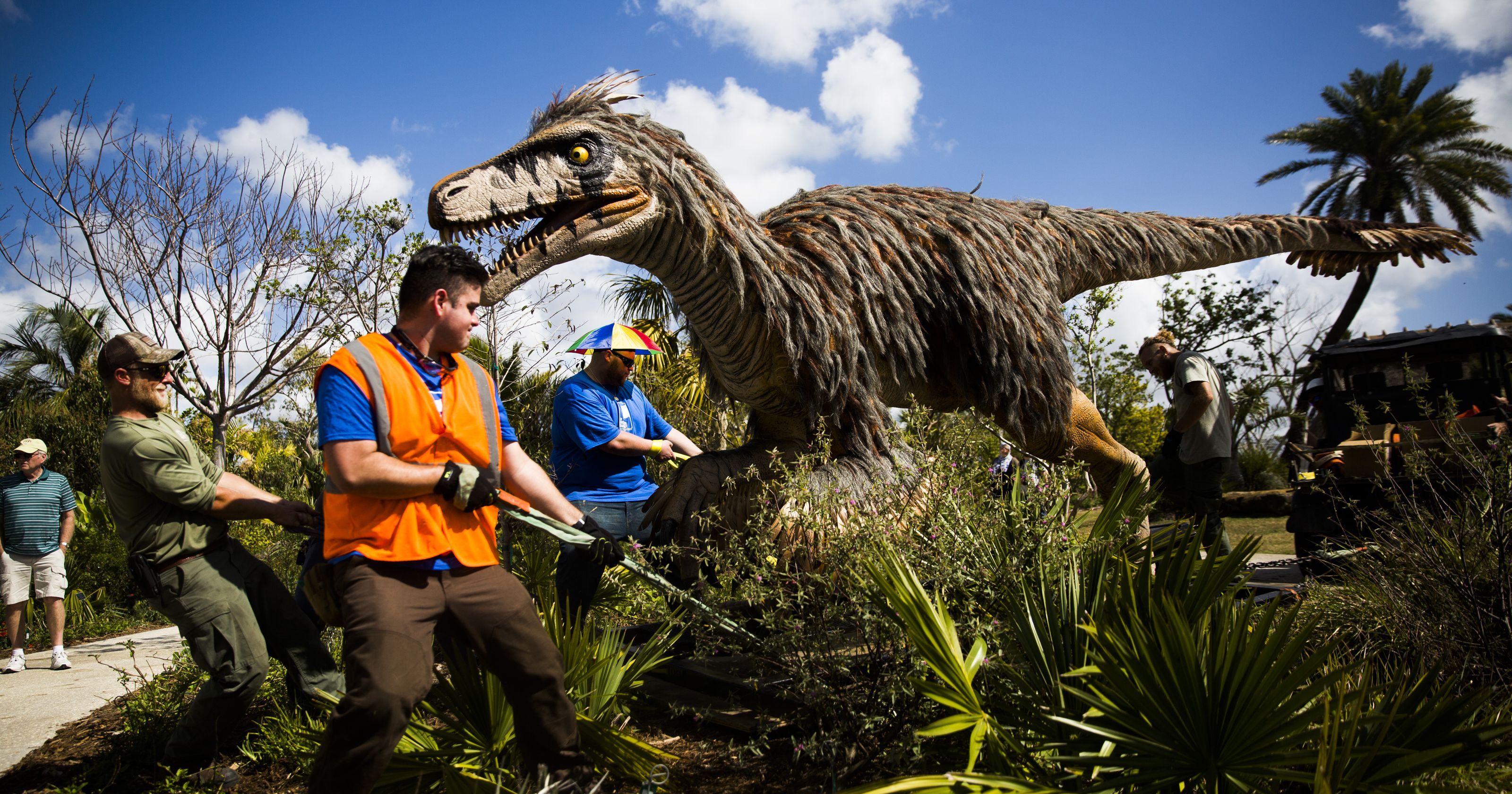 Lurking in the ancient tropical ferns and shrubs of the Naples Botanical Garden, a nearly 8-foot-tall Utahraptor growled and hissed, with its menacing, curved talons and a coat of feathers made of synthetic hair.