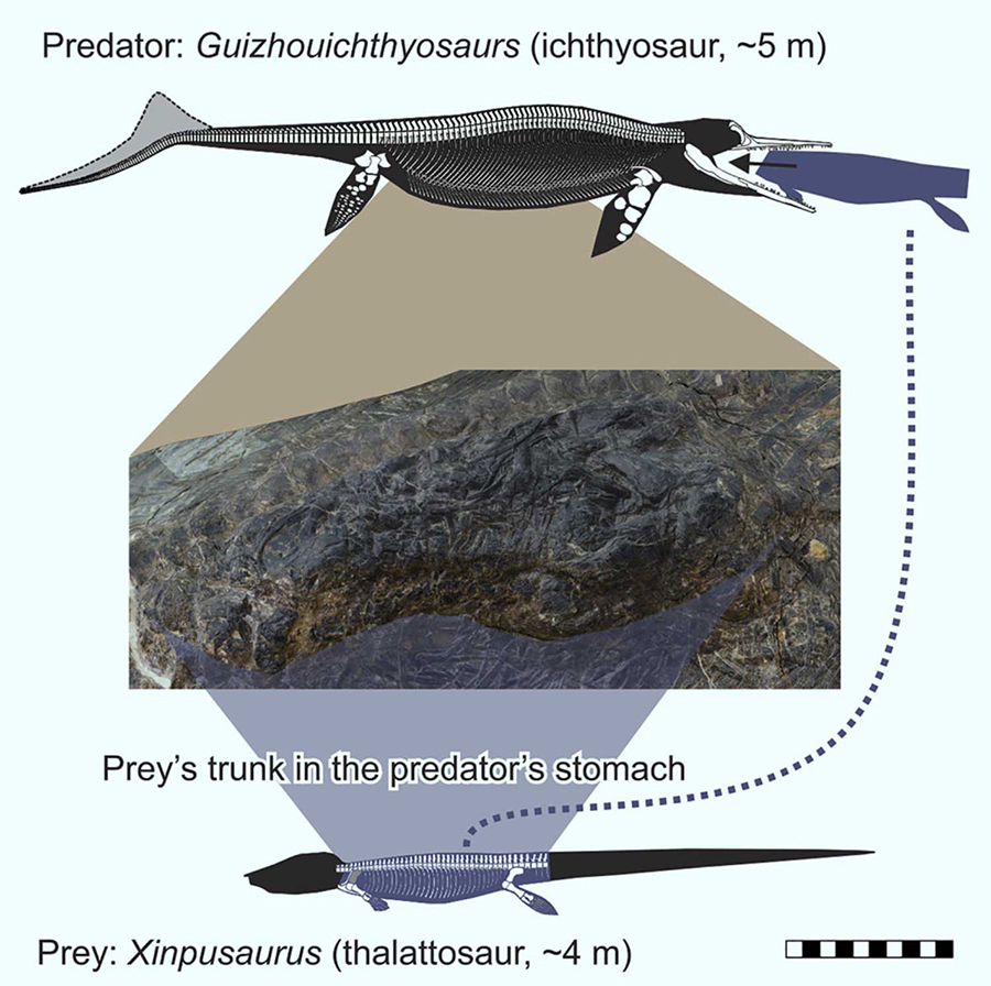 A new fossil of Guizhouichthyosaurus, a 5-m- (16.4-foot) long ichthyosaur that swam in Middle Triassic oceans some 240 million years ago, contains...