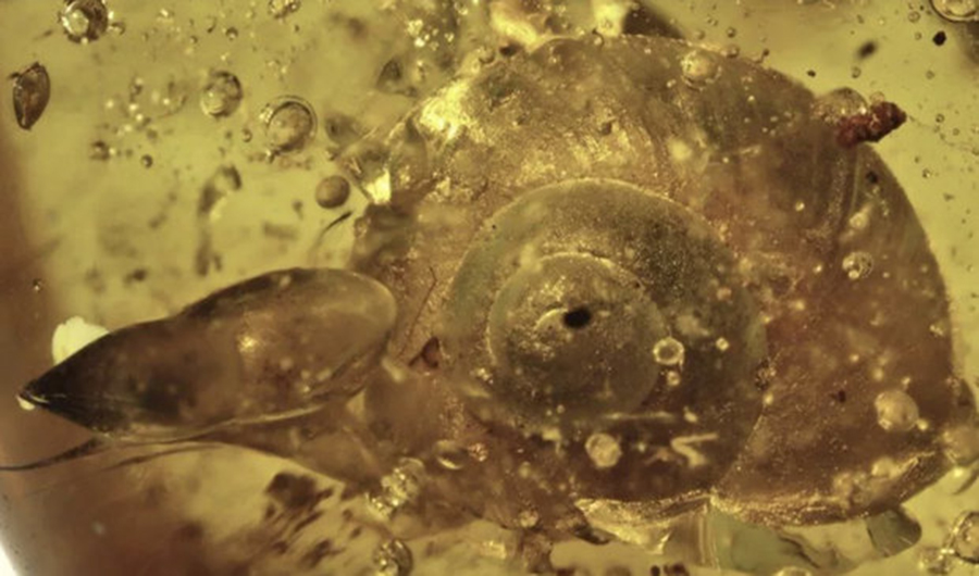 An international team of paleontologists announced in Beijing their discovery of a fossilized snail in a piece of amber dating back around 100 million years.