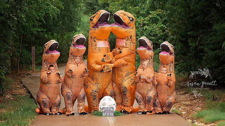 One Texas mom with a funny bone was thrilled to tell the world she was expecting her fifth child — by dressing up her family in inflatable, orange T. rex costumes.