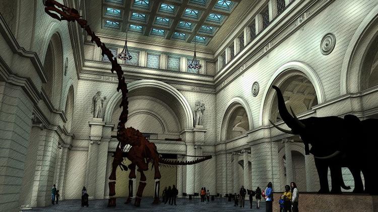 The new titanosaur skeleton cast replacing Sue in the Field Museum’s central Stanley Field...
