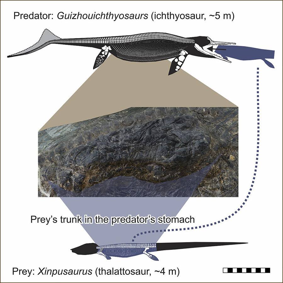 Paleontologists have made the unusual discovery of a near perfect ichthyosaurus skeleton with another impressive skeleton residing within its stomach, proving that the prehistoric reptile was in fact an apex predator.